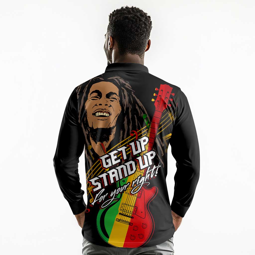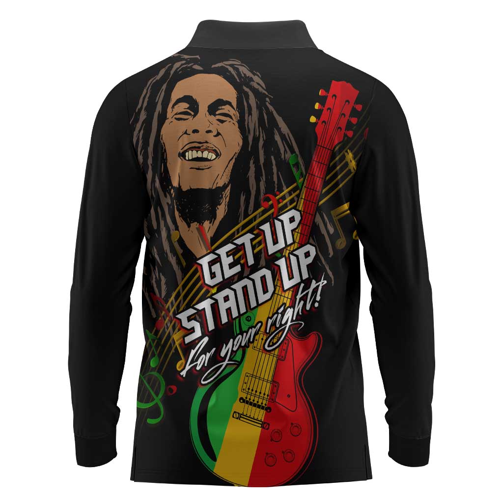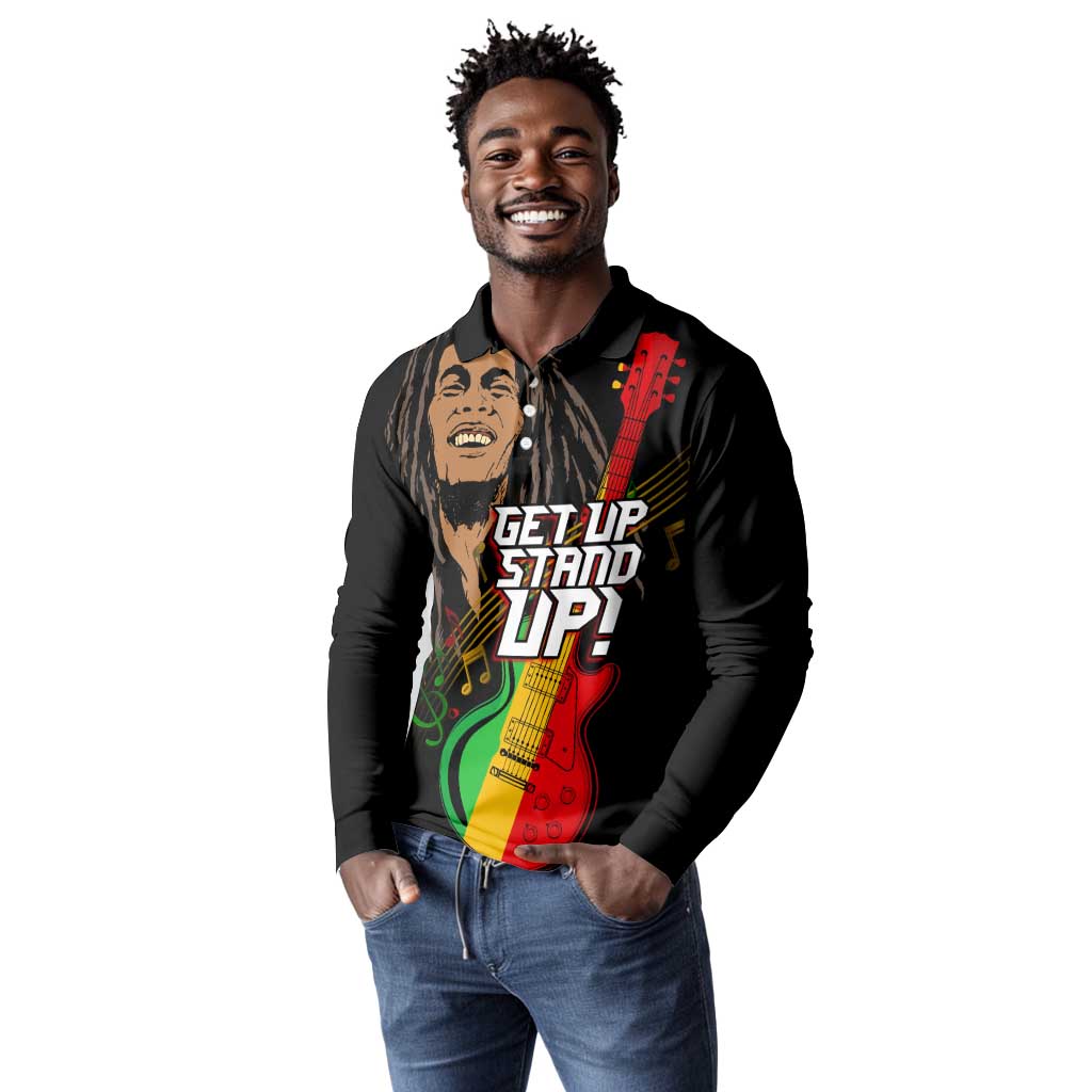 Legend Bob Get Up Stand Up Long Sleeve Polo Shirt Black Jamaican Reggae Multicolored