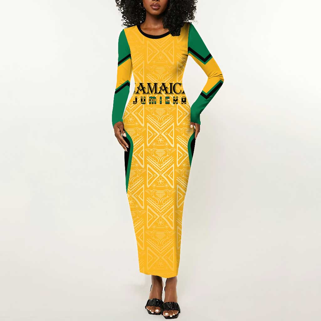 Afro-Jamaica Custom Long Sleeve Bodycon Dress Golden Ethnic Motifs