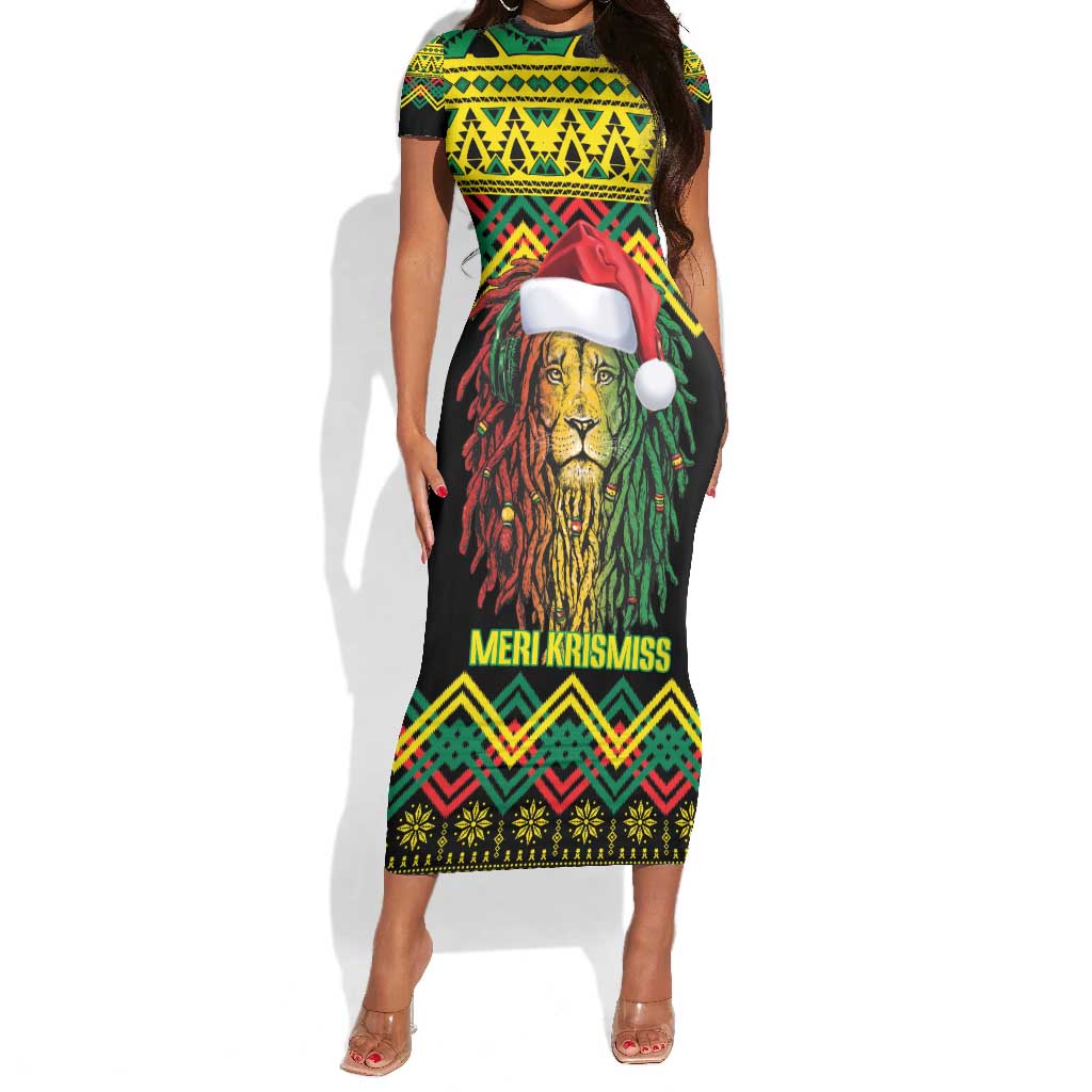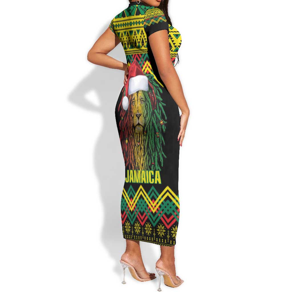 Black Jamaican Christmas Short Sleeve Bodycon Dress Reggae Lion With Kente Pattern