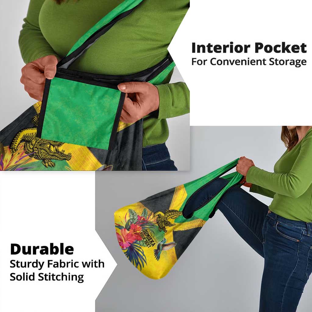 Personalized Black Jamaicans Crocodile Hummingbird Grocery Bag Tropical Flowers Grunge Flag