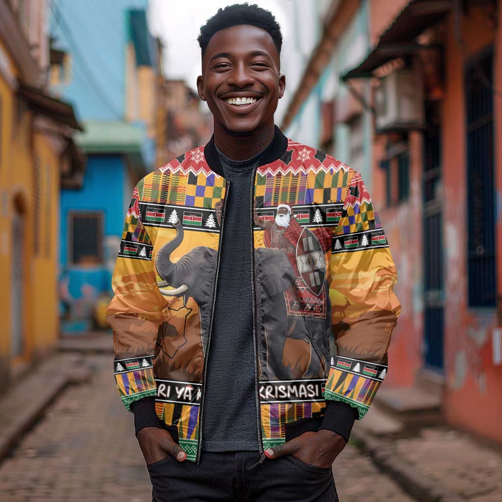Afro Christmas in Kenya Safari Bomber Jacket Black Santa Riding Elephant