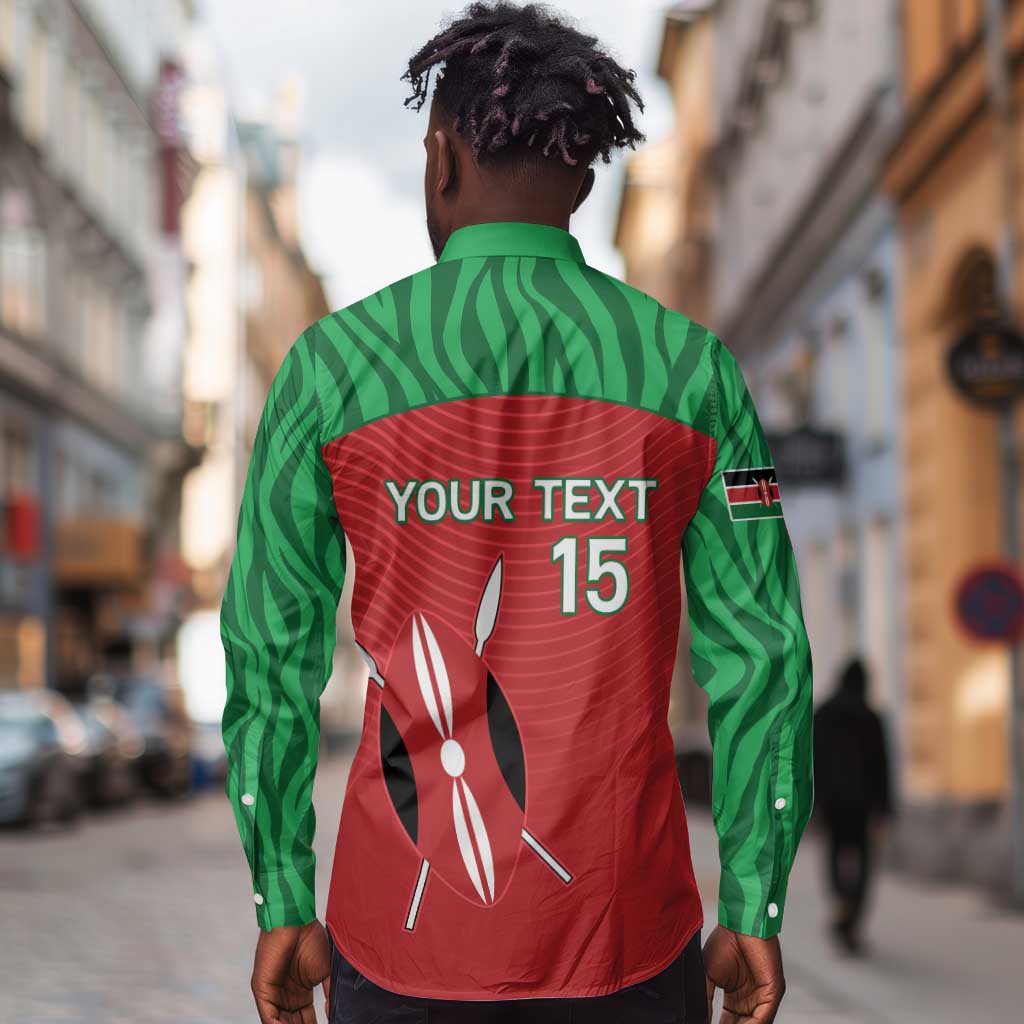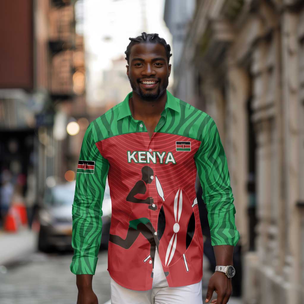 Custom Afro Athletics Kenya Long Sleeve Button Shirt Kenyan Runner - Maasai Shield