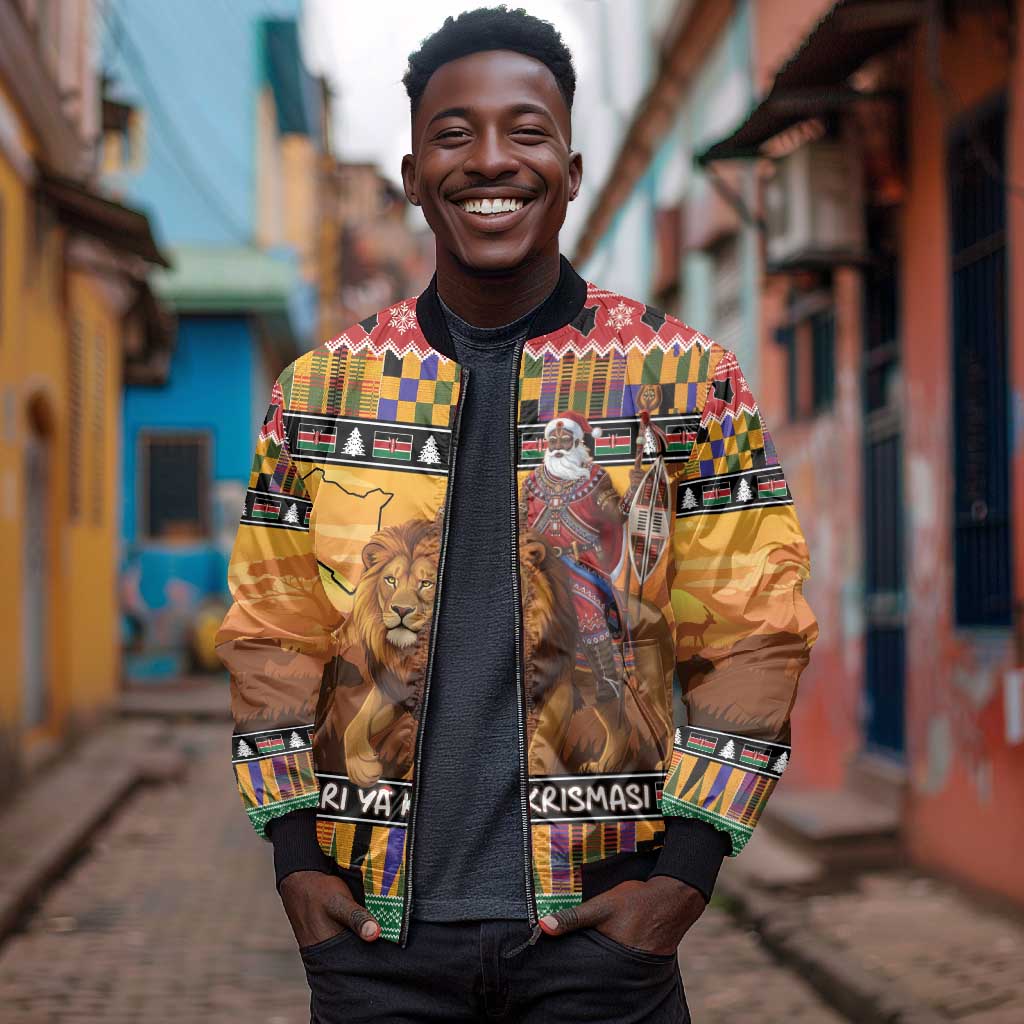 Afro Christmas in Kenya Safari Bomber Jacket Black Santa Riding Lion