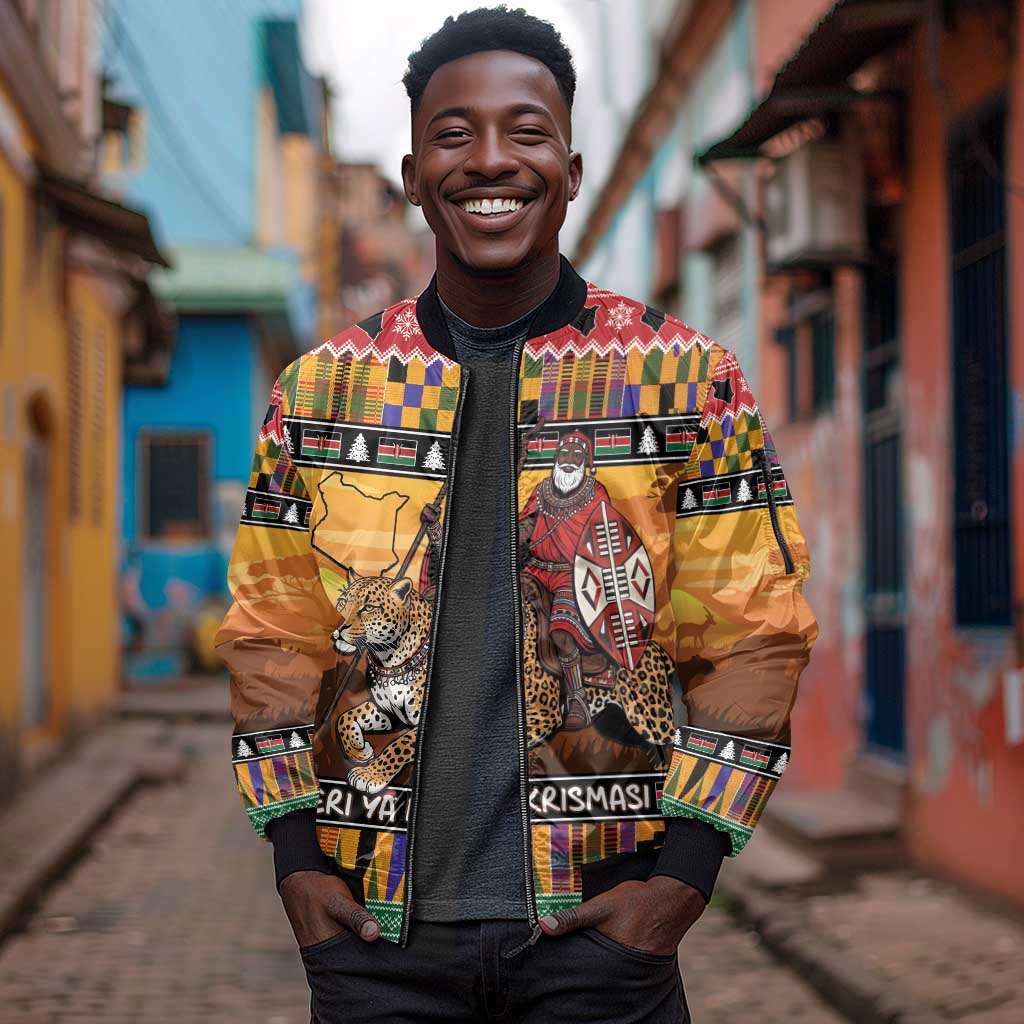 Afro Christmas in Kenya Safari Sleeve Zip Bomber Jacket Black Santa Riding Leopards