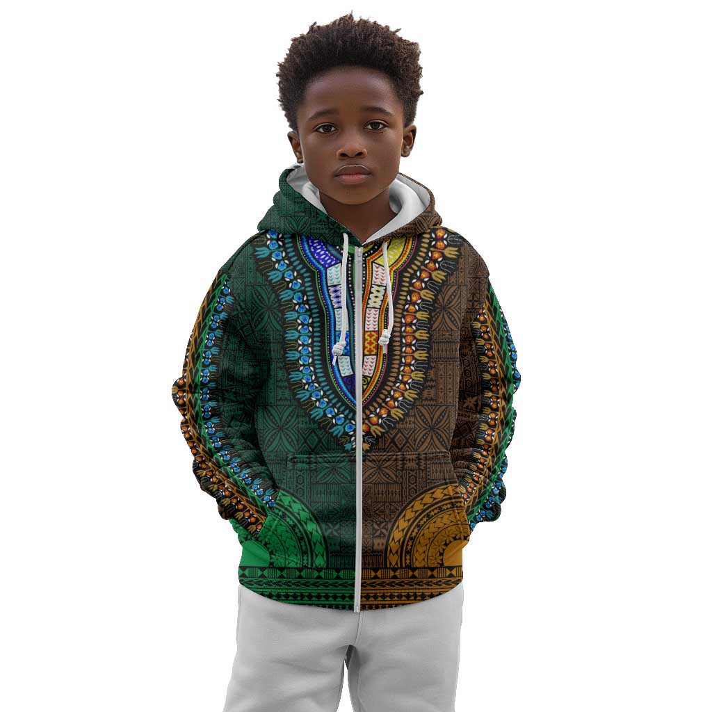 Green-gold Dashiki and Tapa Pattern Kid Hoodie Africa-Polynesia Together Culture