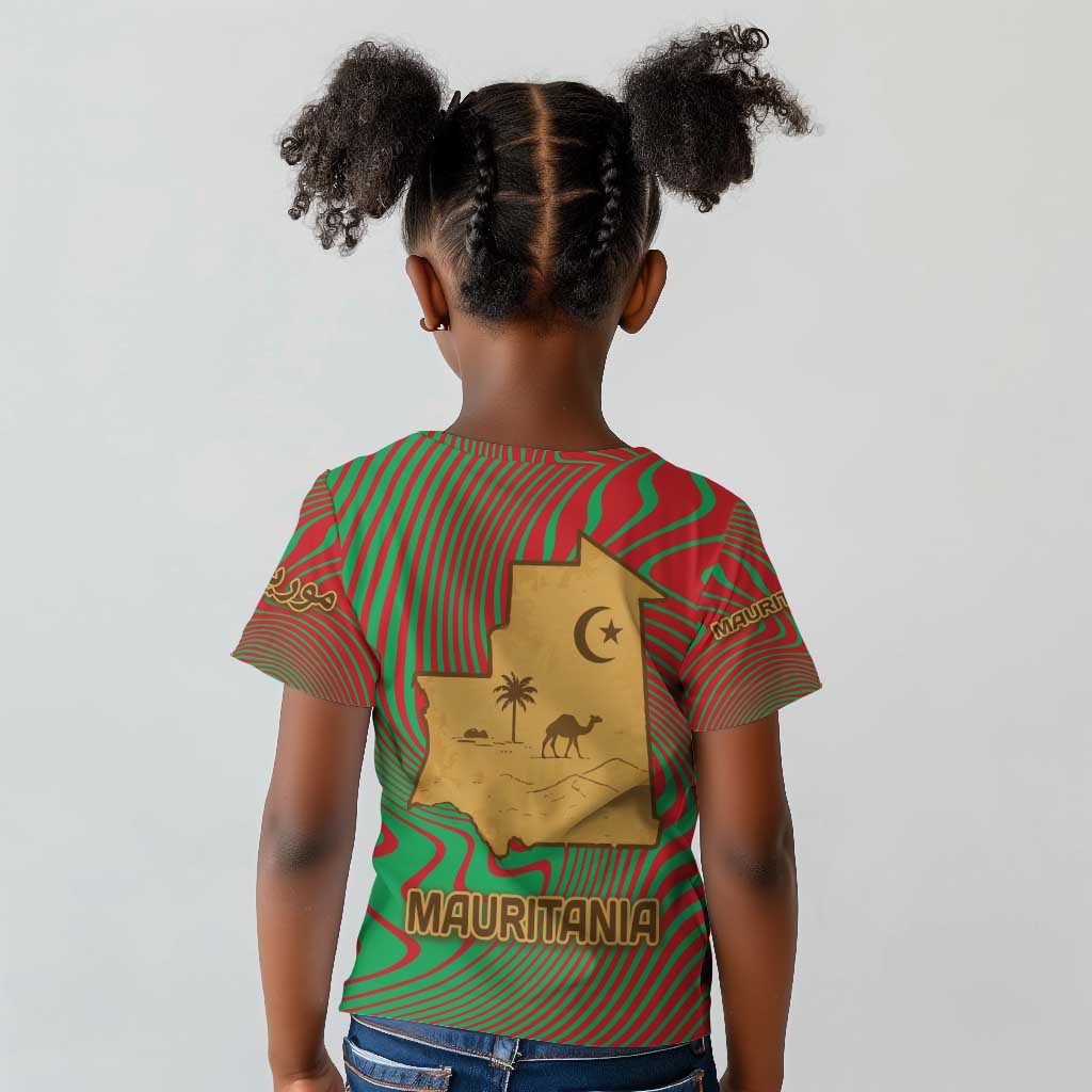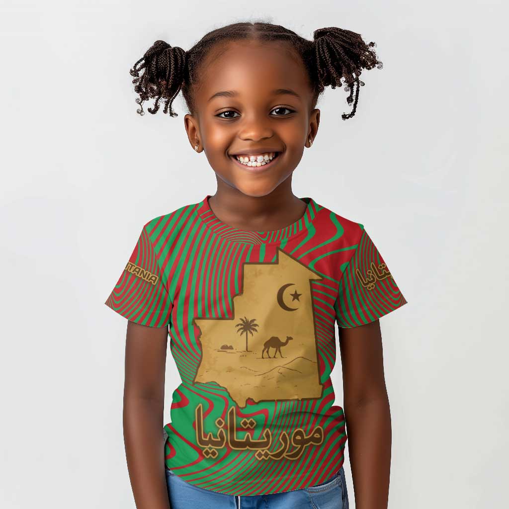 Mauritania Kid T shirt - Desert Camel Crescent Moon and Palm Tree Graphic in Red Green Gold Pattern