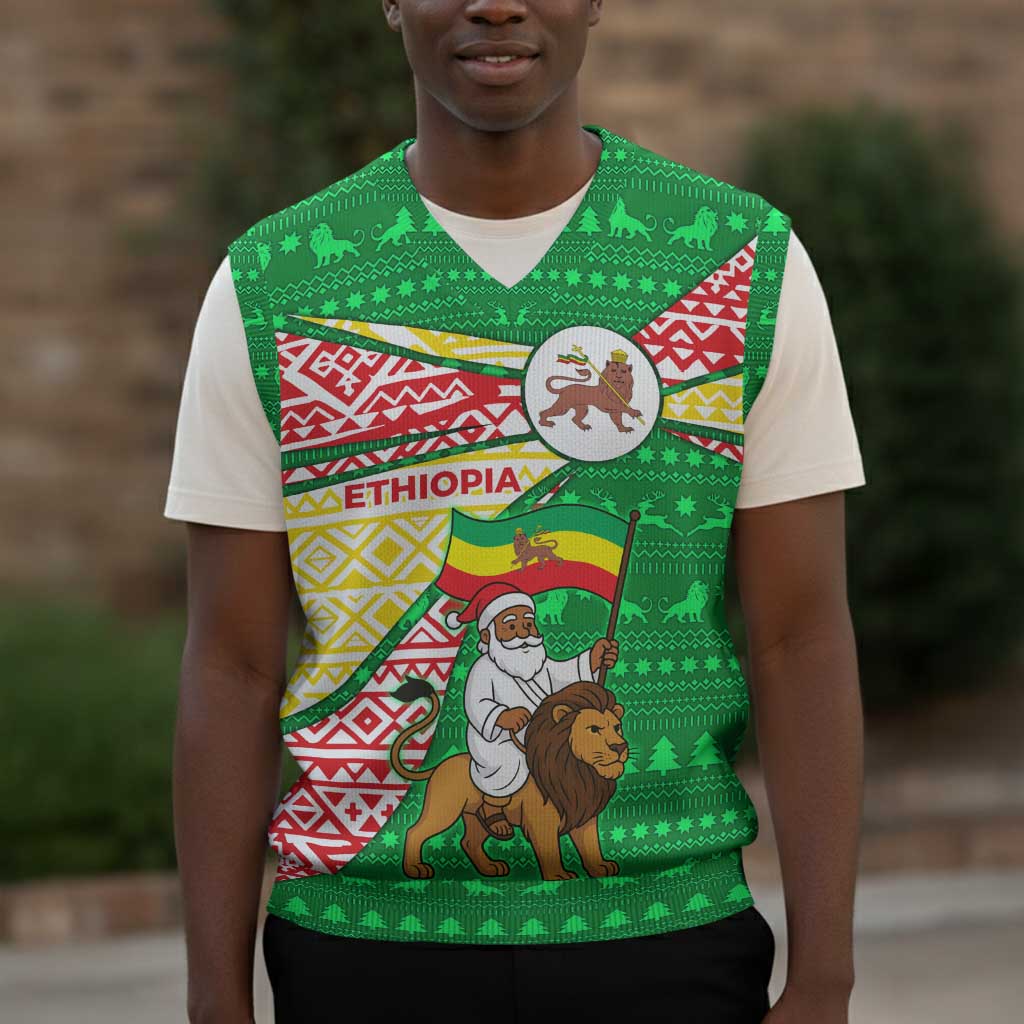 Ethiopia Christmas Knitted V-Neck Vest Santa Riding Lion Ethiopian Flag Colors and Tribal