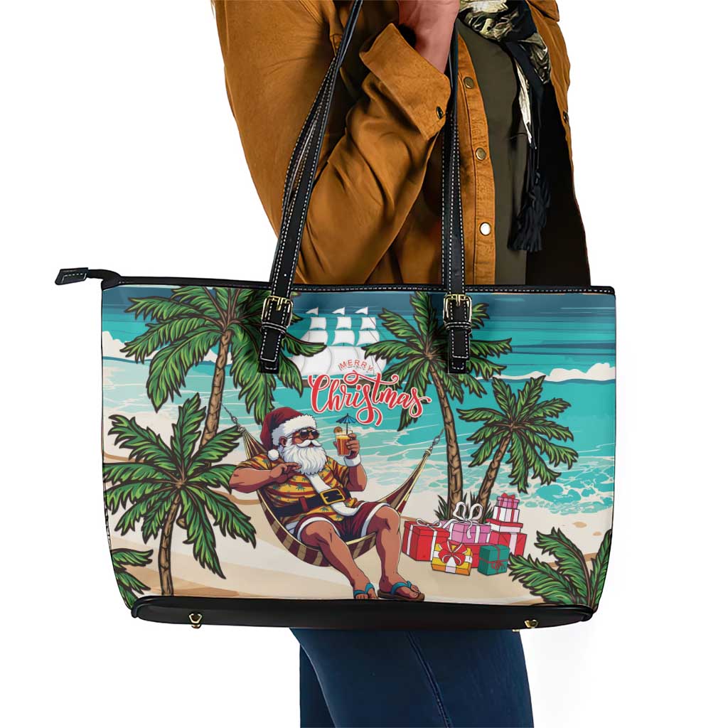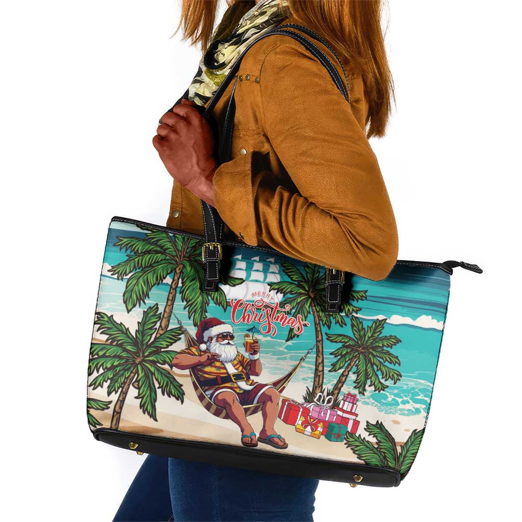 Afro Christmas in Liberia Leather Tote Bag Santa Chill on Tropical Beach
