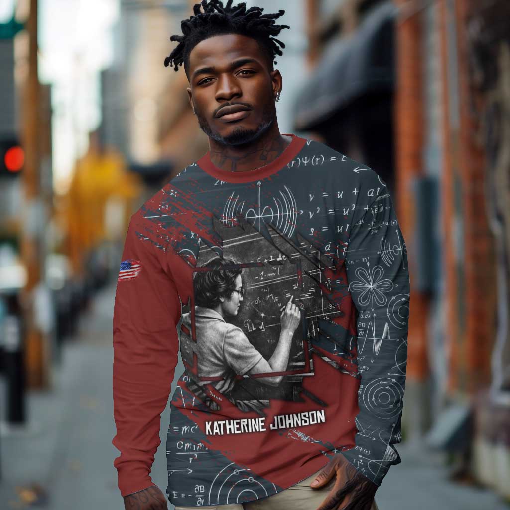 Katherine Johnson Long Sleeve Shirt with Chalkboard Math Scene, Verify the Numbers Quote and Space Orbit