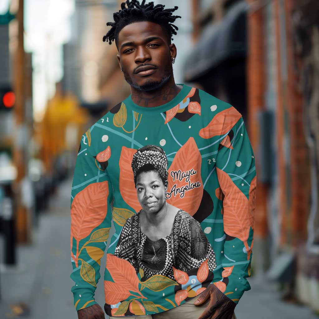 Maya Angelou Long Sleeve Shirt Inspirational Quote Design Vibrant Teal and Orange Leaf Motif