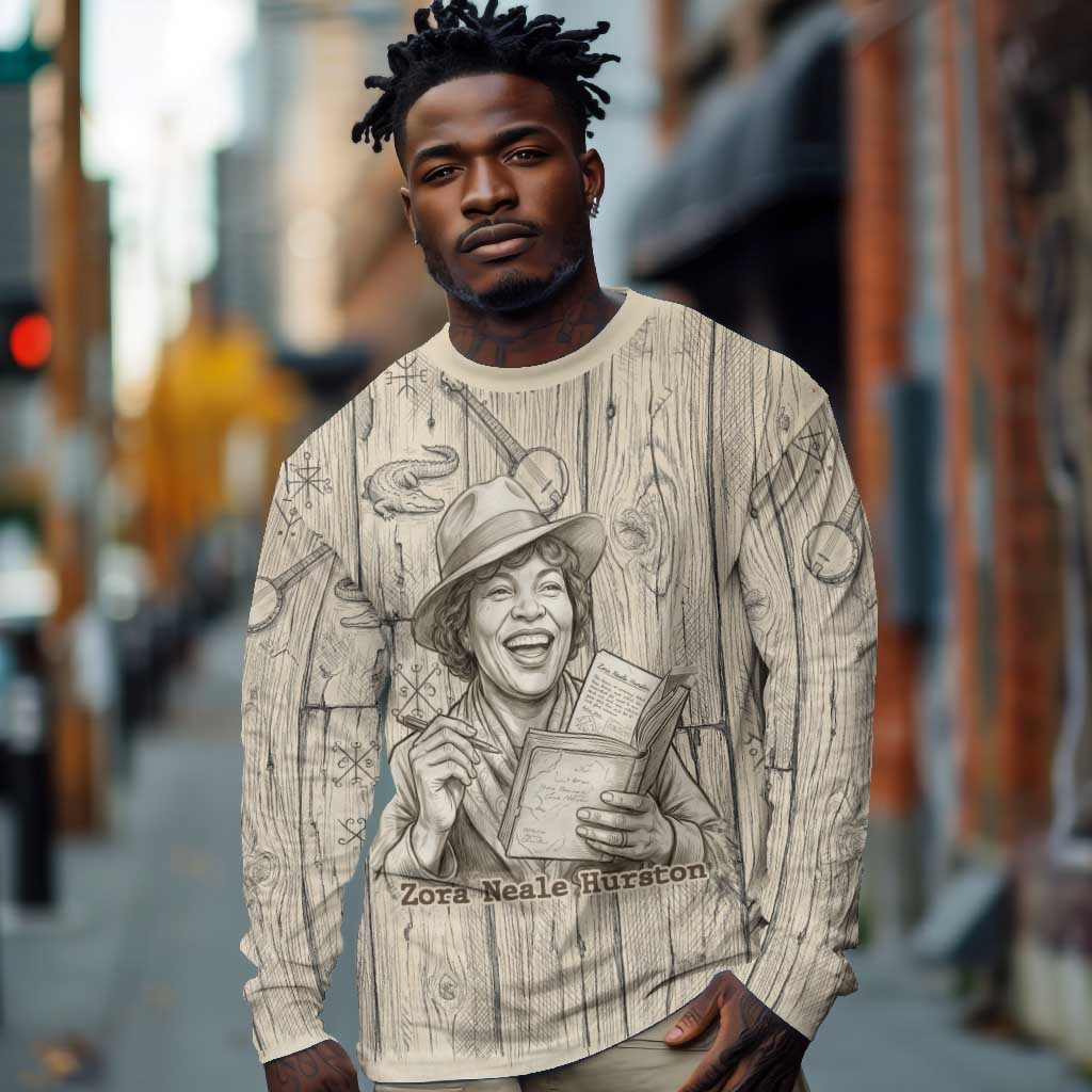 Zora Neale Hurston Long Sleeve Shirt Rustic Wood Engraved Style Illustration Joyful Portrait with Book and Map Donkey