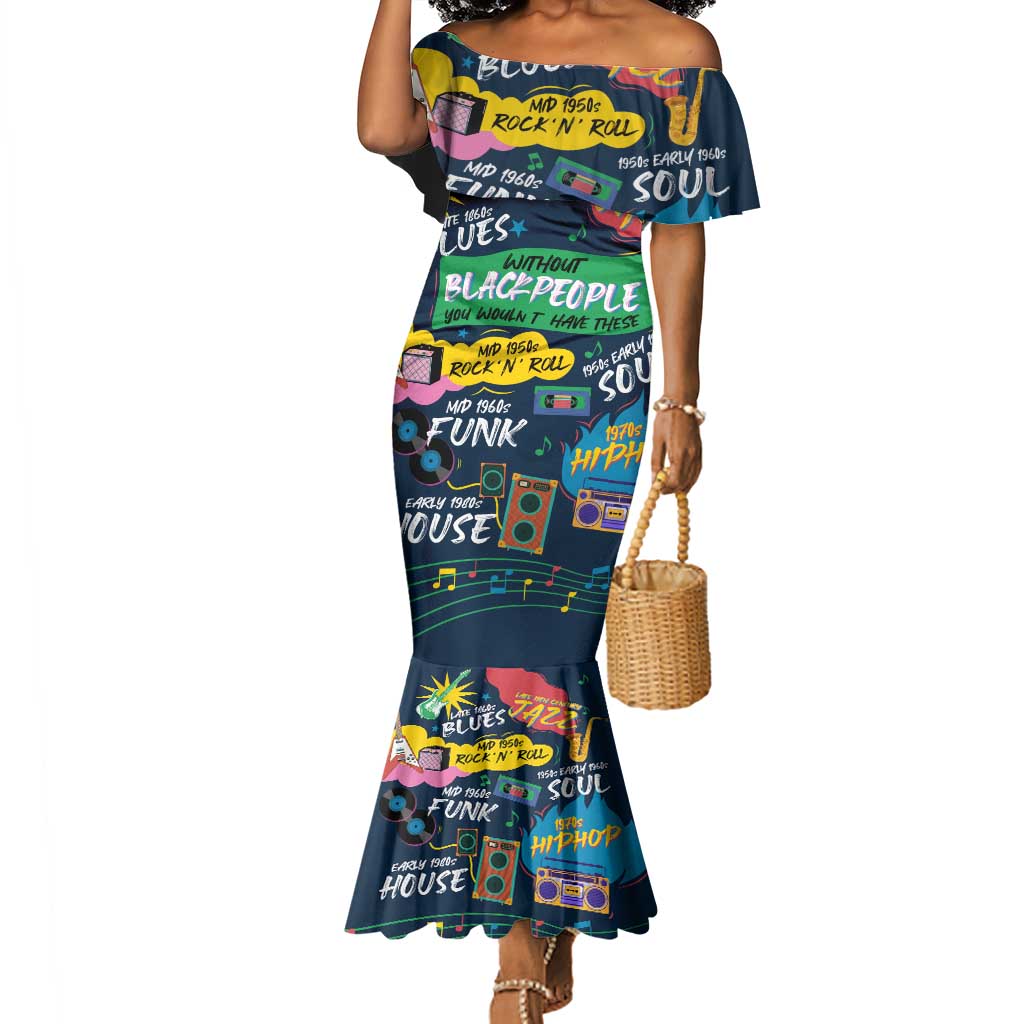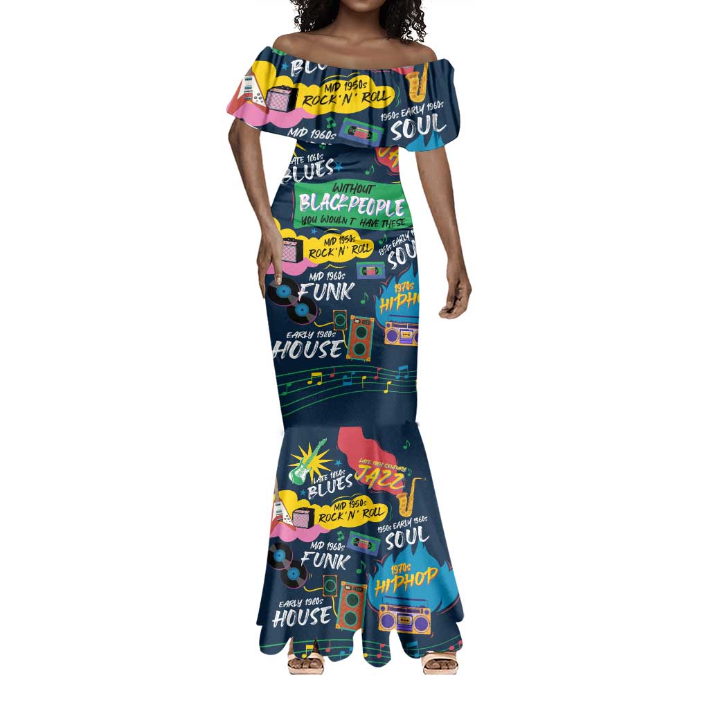 Design: Off-the-shoulder design with a body-hugging fit that flares out at the bottom, creating a stunning mermaid silhouette. Features vibrant, intricate patterns as shown in the pictures.