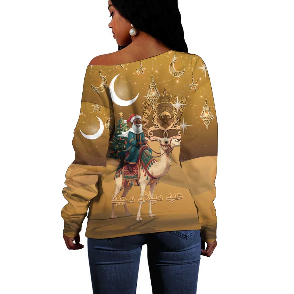 Afro Christmas in Sahara Morocco Off Shoulder Sweater Black Santa Riding Camel