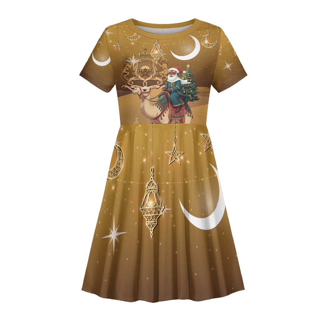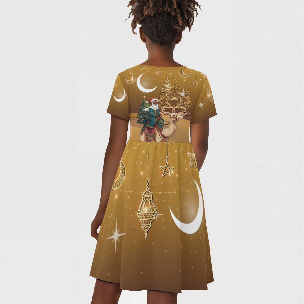 Afro Christmas in Sahara Morocco Kid Short Sleeve Dress Black Santa Riding Camel