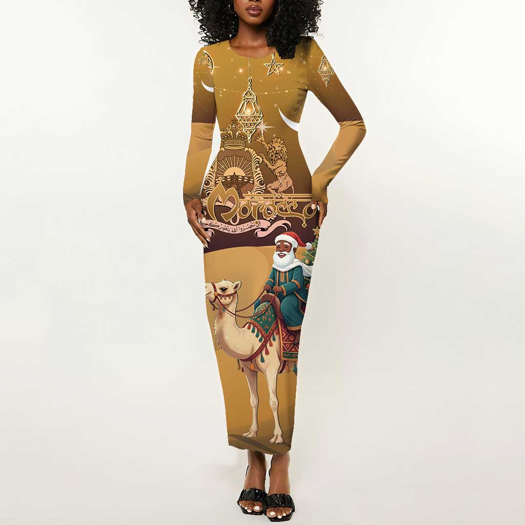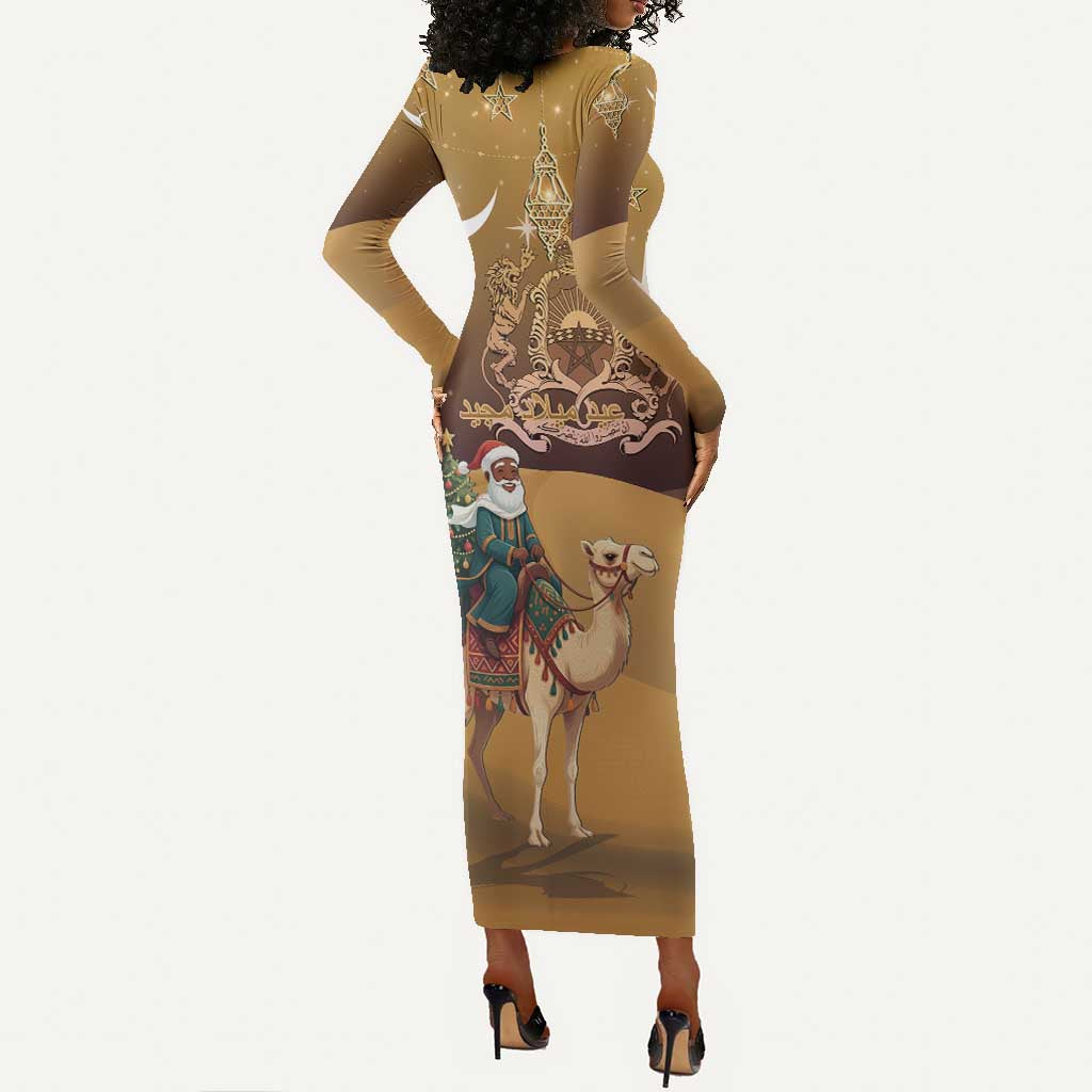 Afro Christmas in Sahara Morocco Long Sleeve Bodycon Dress Black Santa Riding Camel