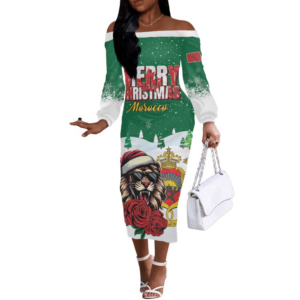 Morocco Christmas Off The Shoulder Long Sleeve Dress Santa Lion With Rose Xmas Vibe