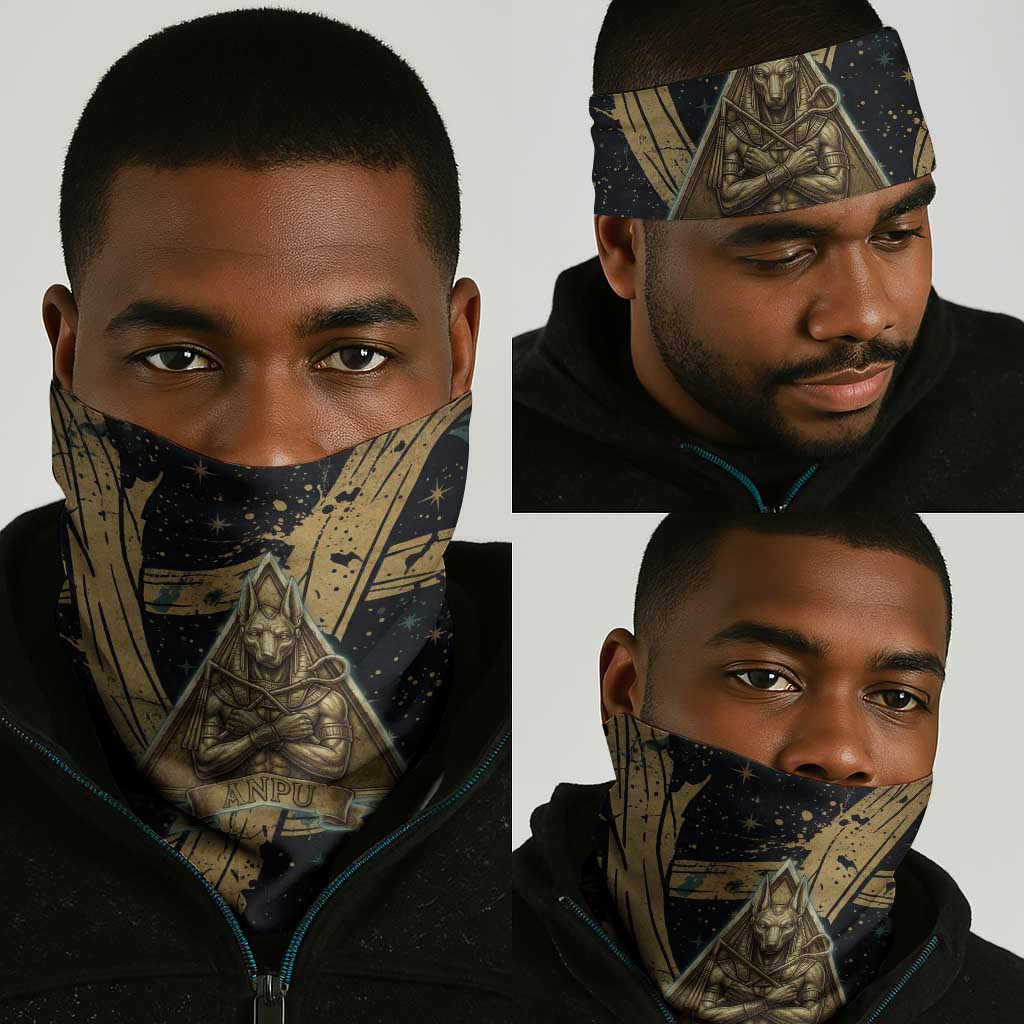 Anubis Ancient Egyptian Neck Gaiter with Starry Mummy Wrap Pattern, Anubis Warrior Illustration, and Pyramid