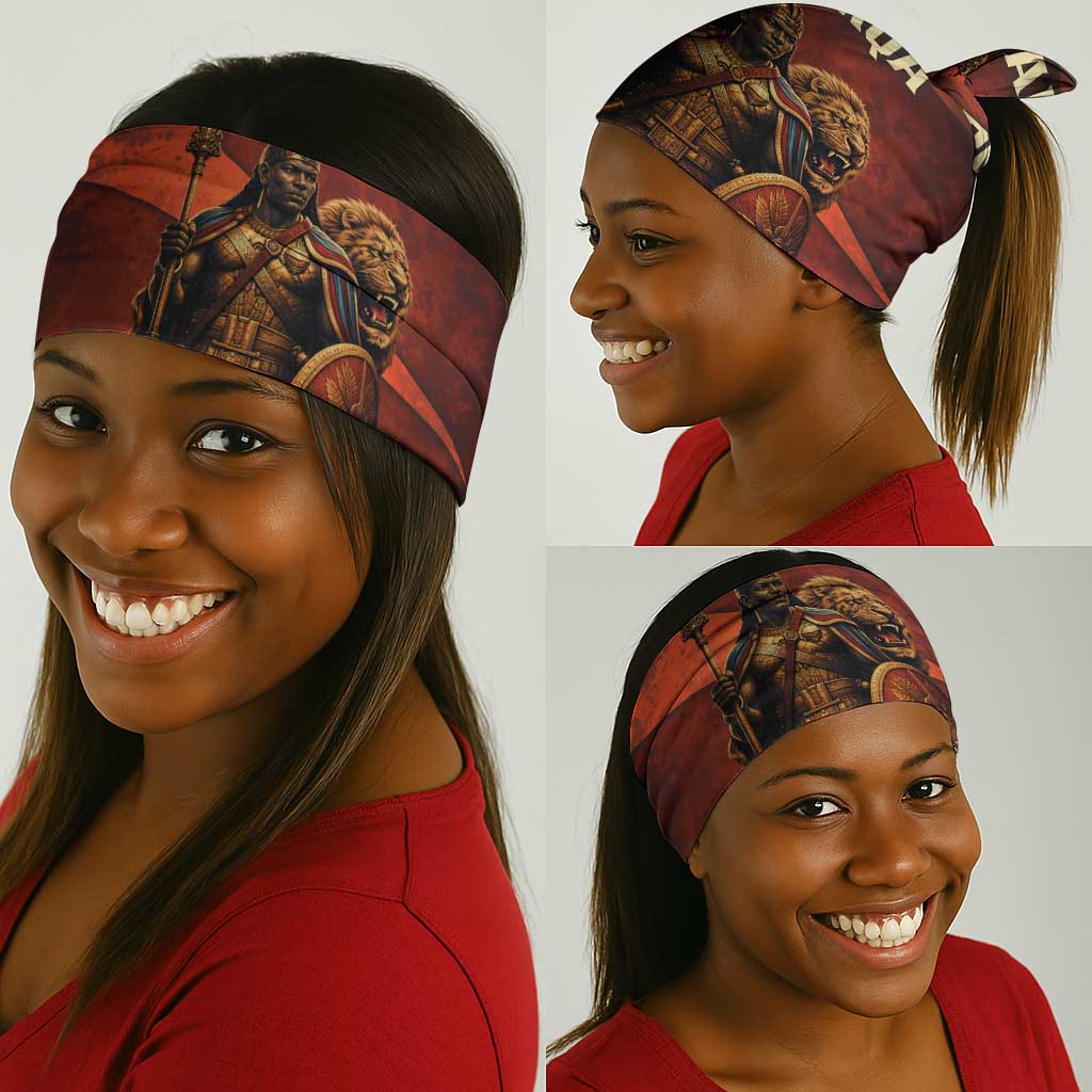 Taharqa Neck Gaiter with Warrior Portrait, Lion of Kush Title and Bold Red Defender of Africa