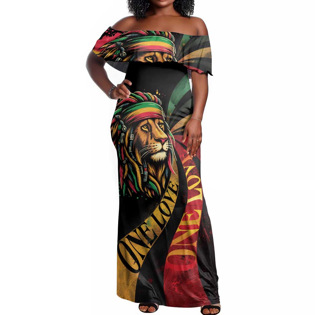 Black Jamaican Off Shoulder Maxi Dress Rastafarian Lion One Love