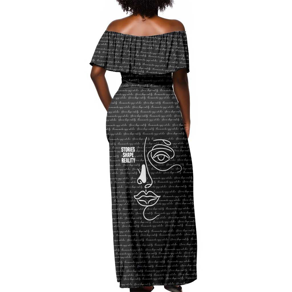 Chimamanda Ngozi Adichie Off Shoulder Maxi Dress with Expressive Speaking Portrait, Stories Shape Reality TS04