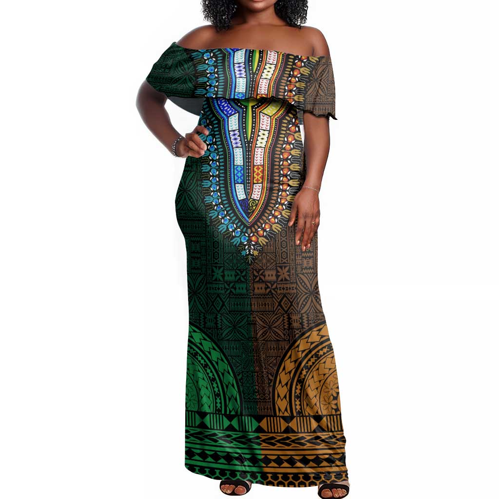 Green-gold Dashiki and Tapa Pattern Off Shoulder Maxi Dress Africa-Polynesia Together Culture