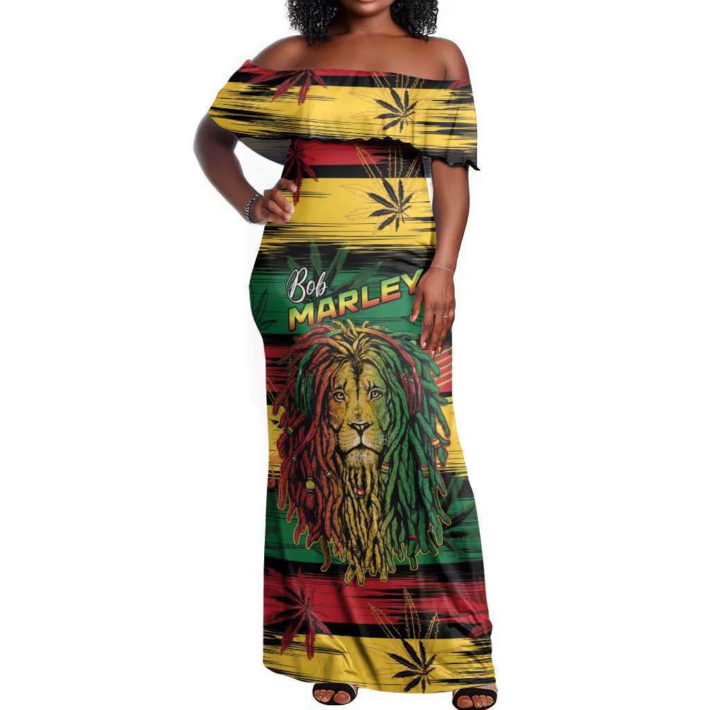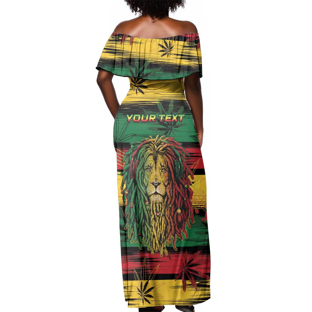 Personalised Rastafarian Lion Off Shoulder Maxi Dress Cannabis Leaf Pattern