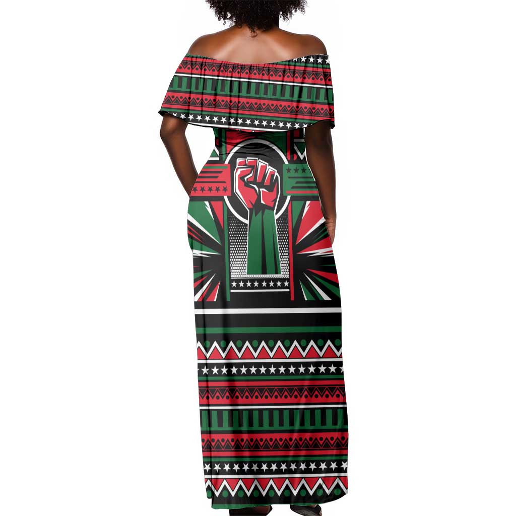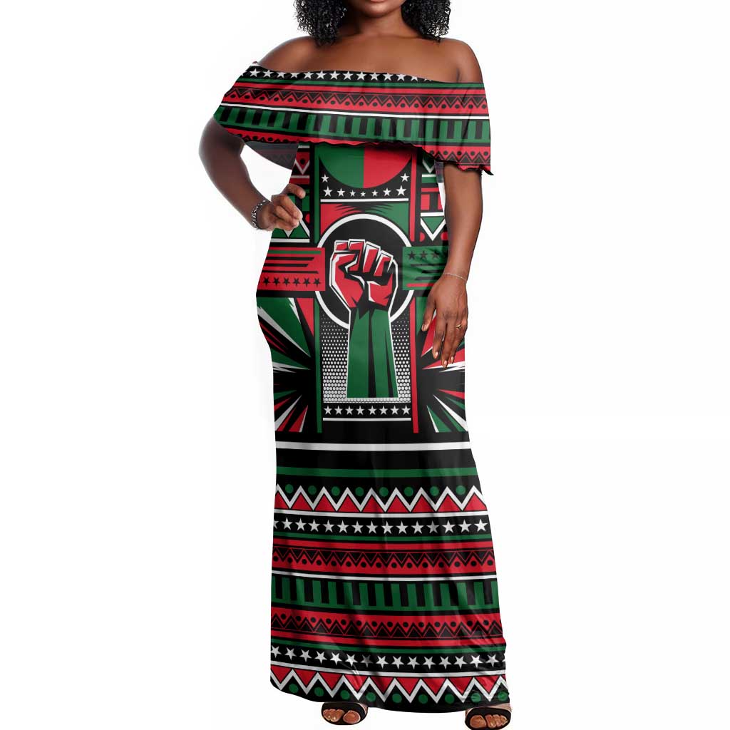 Power Fist And Patterns In Pan African Off Shoulder Maxi Dress