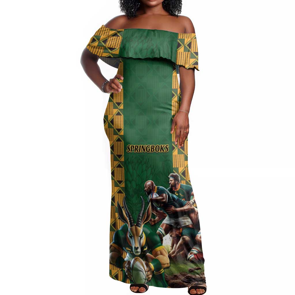 South Africa Rugby Off Shoulder Maxi Dress - Springbok Mascot, Players Fighting for Victory