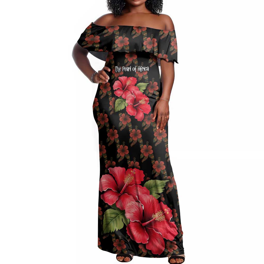 Uganda Off Shoulder Maxi Dress - Hibiscus Flower Pattern and The Pearl of Africa Text