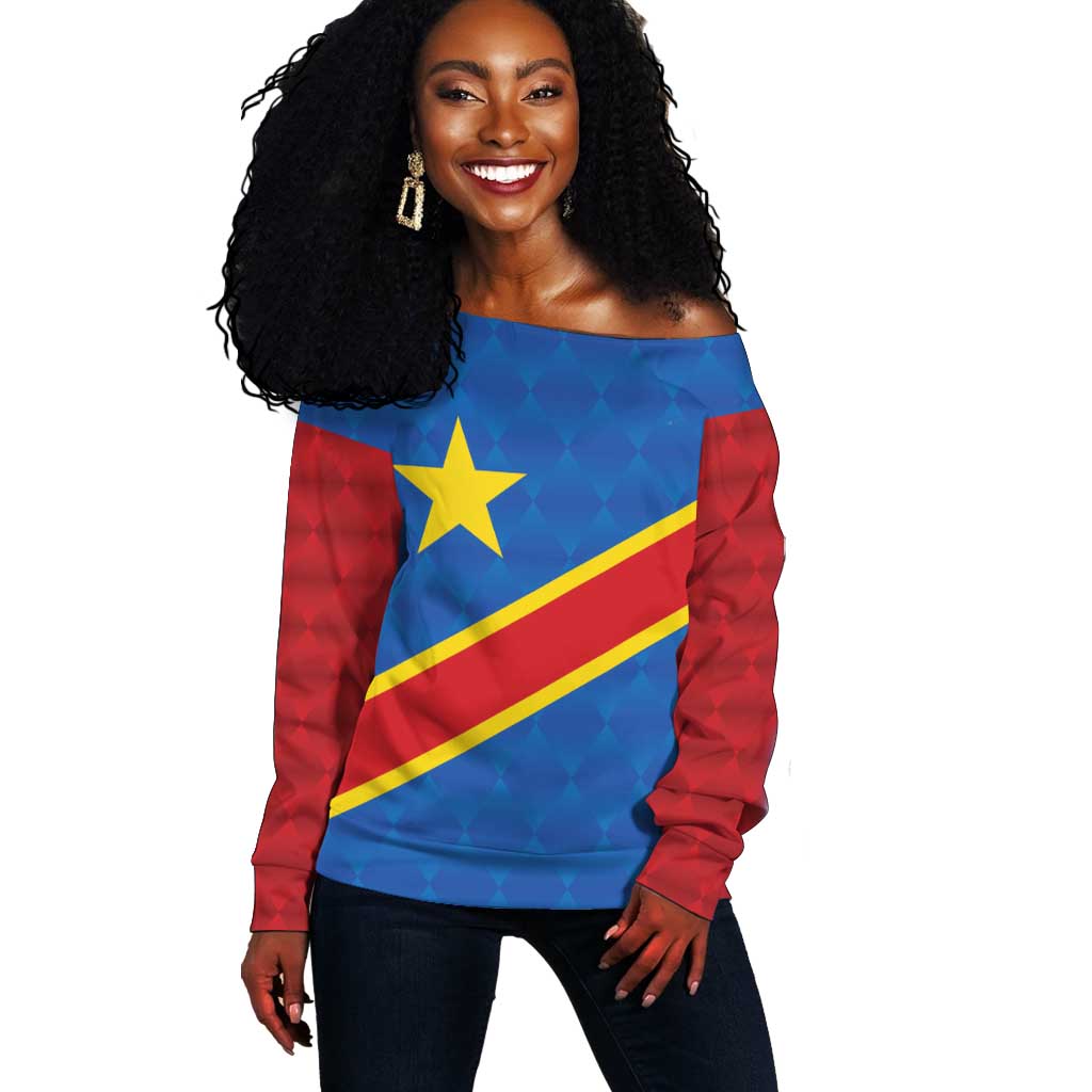 Africa DR Congo Football Custom Off Shoulder Sweater Blue Leopard Skin Pattern