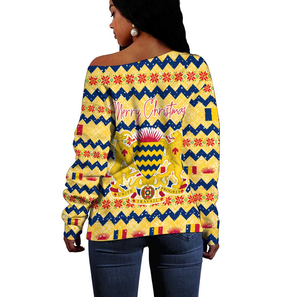 Chad Christmas Off Shoulder Sweater National Coat of Arms, and Festive Motif