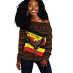 Uganda Off Shoulder Sweater - Crested Crane and Rise and Shine Tribal Pattern Design