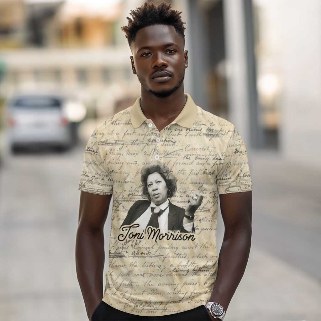 Toni Morrison Polo Shirt Handwritten Manuscript Powerful Portrait with Feather Pen Quote