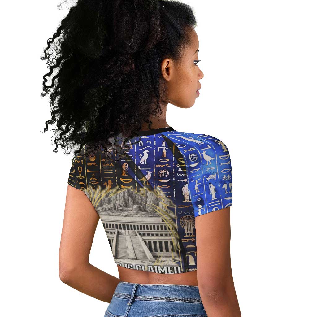 Hatshepsut Raglan Cropped T shirt with Queen King Portrait, Temple Illustration and Blue-Gold Hieroglyphic