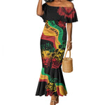 Design: Off-the-shoulder design with a body-hugging fit that flares out at the bottom, creating a stunning mermaid silhouette. Features vibrant, intricate patterns as shown in the pictures.