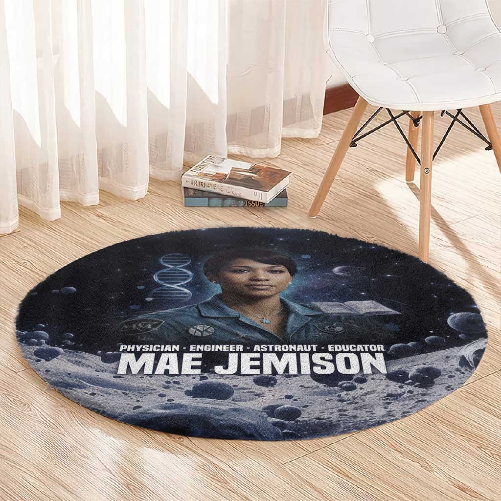 Mae Jemison Round Carpet with Space Portrait Design, Science Has No Boundaries Quote and DNA Book Elements
