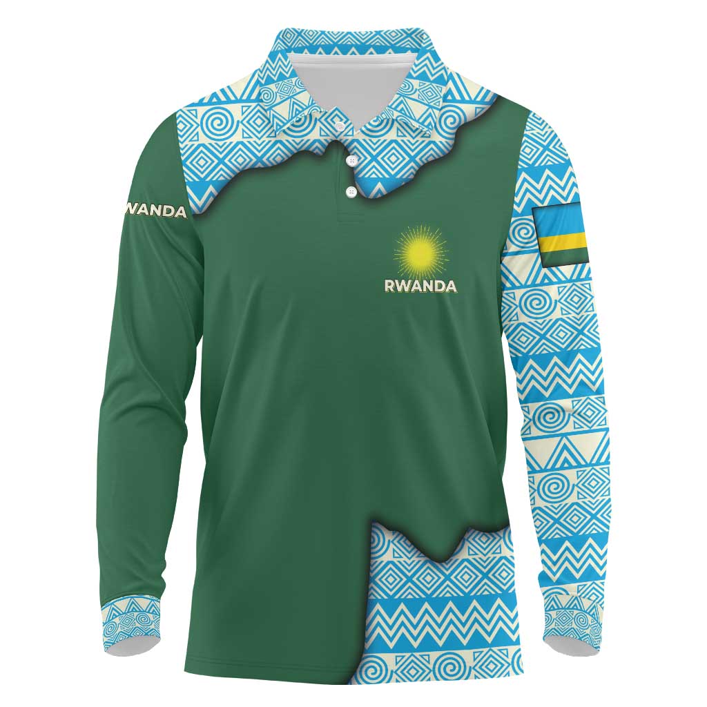 Rwanda Long Sleeve Polo Shirt with Green Nature Map Waterfall Sunburst Spirit