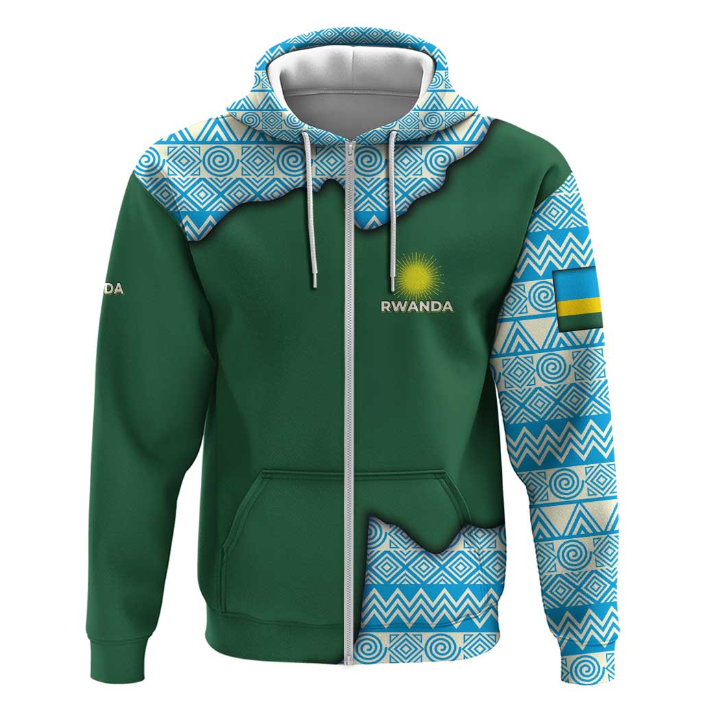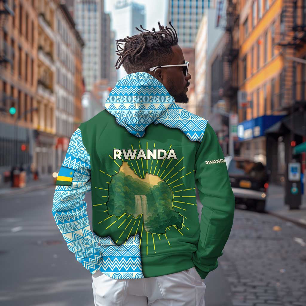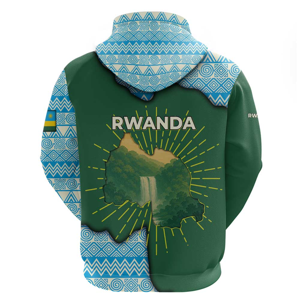 Rwanda Zip Hoodie with Green Nature Map Waterfall Sunburst Spirit