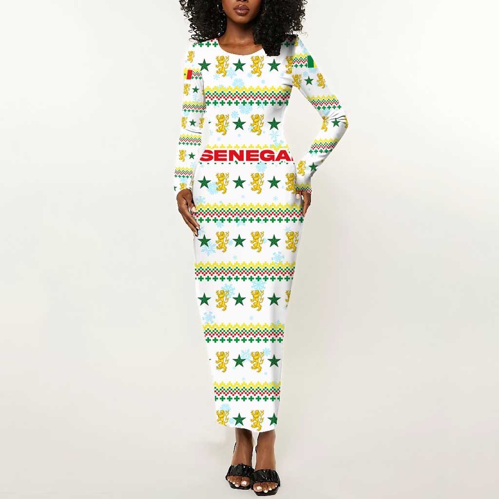 Senegal Christmas Long Sleeve Bodycon Dress Golden Lion and Festive Stars Motif