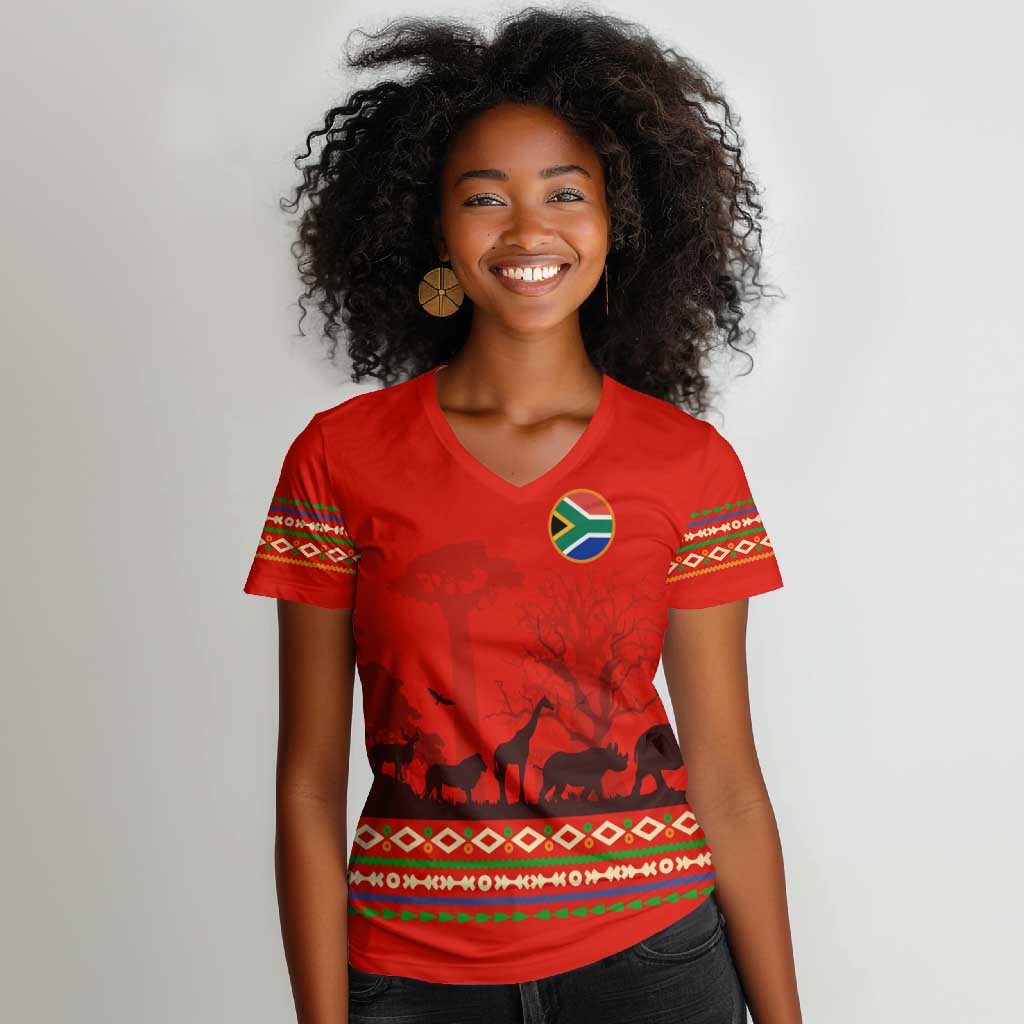 Wildlife South Africa Women V-Neck T-Shirt Tribal Pattern National Flag Safari Silhouettes TS04
