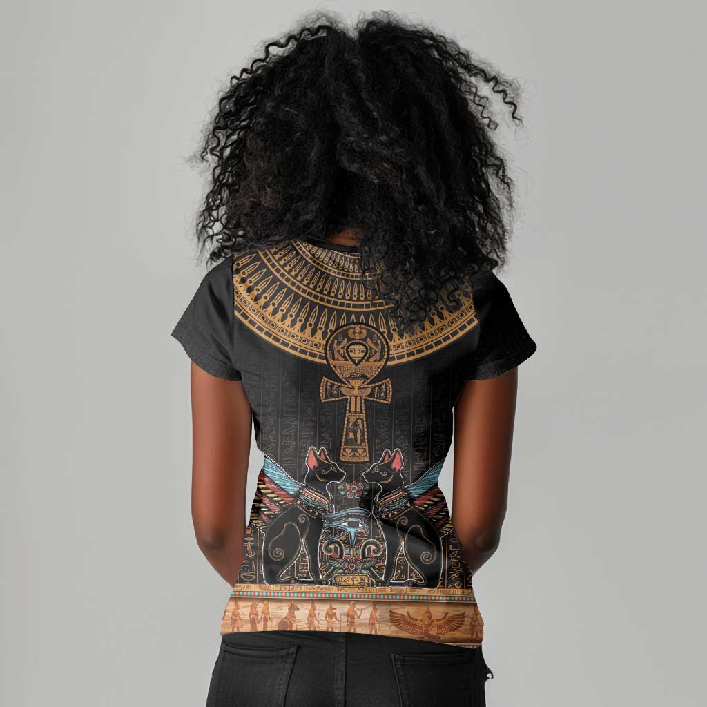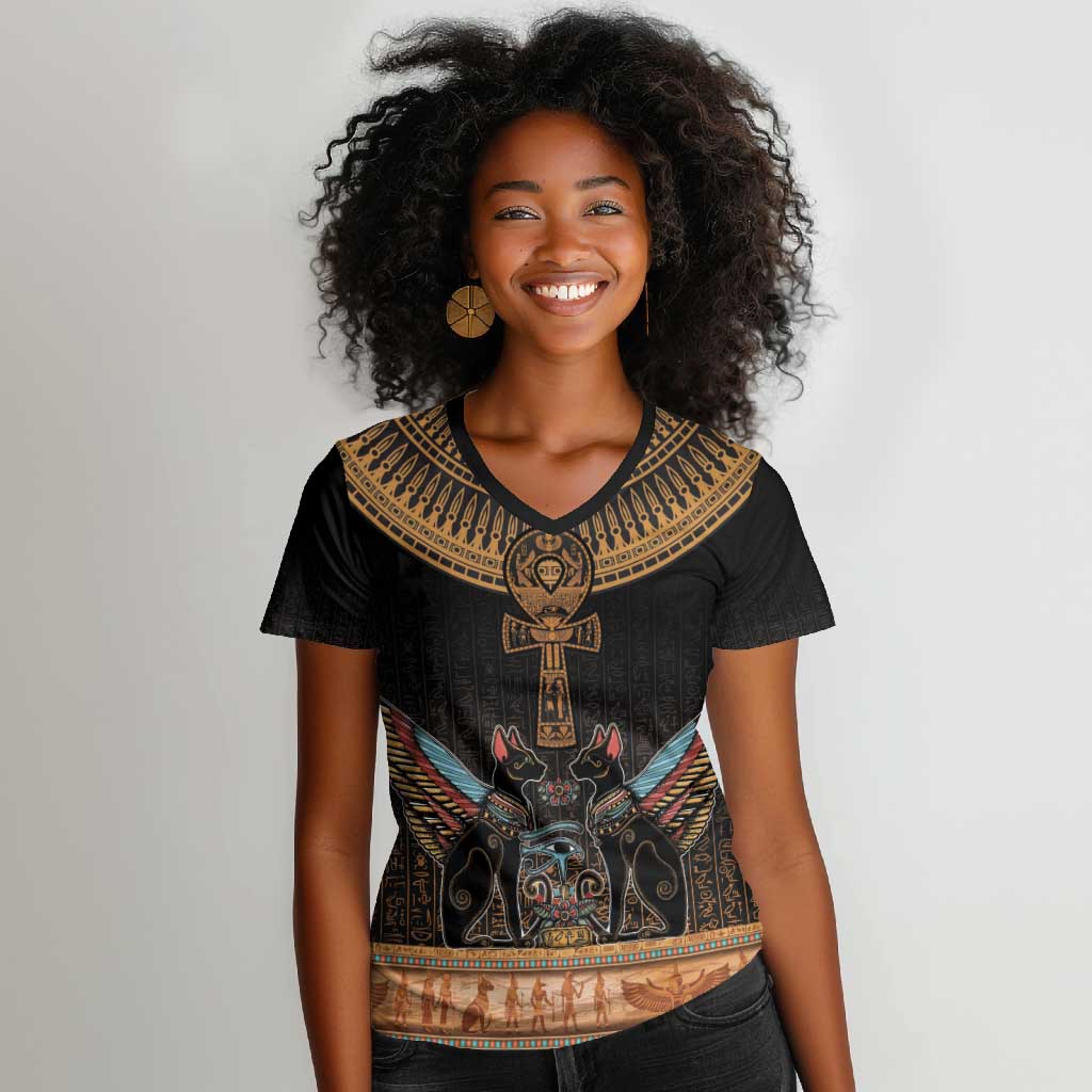 Winged Egypt Cats Women V-Neck T-Shirt Hieroglyphs Alphabet Pattern