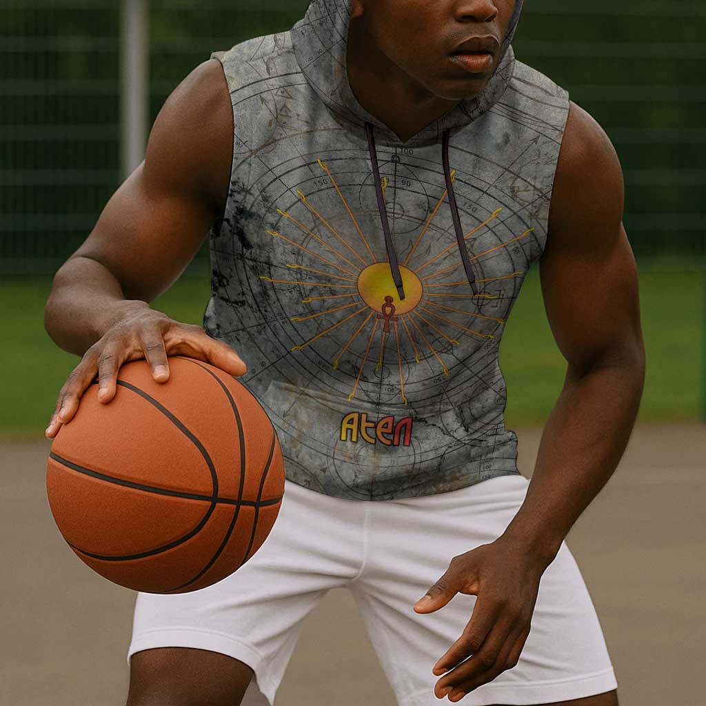 Aten Ancient Egyptian Sleeveless Hoodie with Gray Astronomical Chart, Radiant Sun Disc Emblem, and Ankh