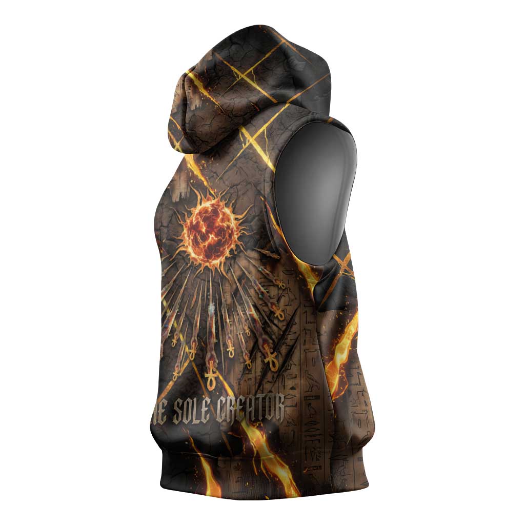 Aten Sleeveless Hoodie Ancient Egyptian Cracked Stone Hieroglyph, Solar Eclipse Emblem, and Radiant Sunburst