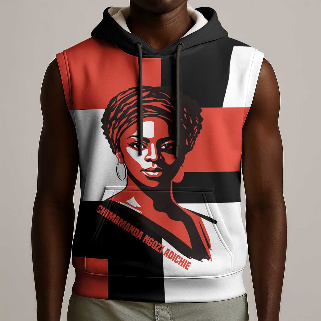 Chimamanda Ngozi Adichie Sleeveless Hoodie with Bold Red Portrait, We Should All Be Feminists Quote