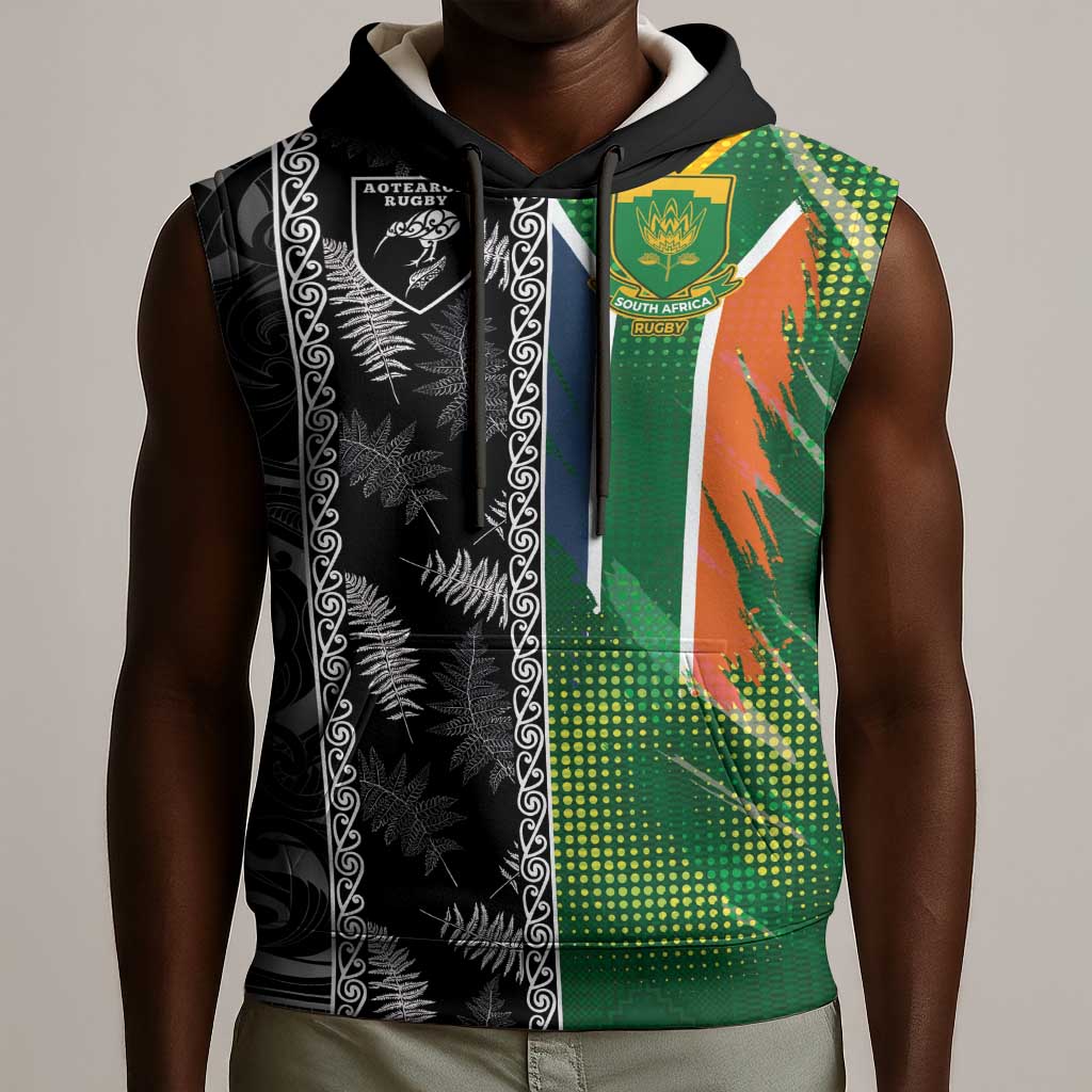 Custom Aotearoa South Africa Rugby Freedom Cup Sleeveless Hoodie Maori Silver Fern Art and Sporty Flag SA