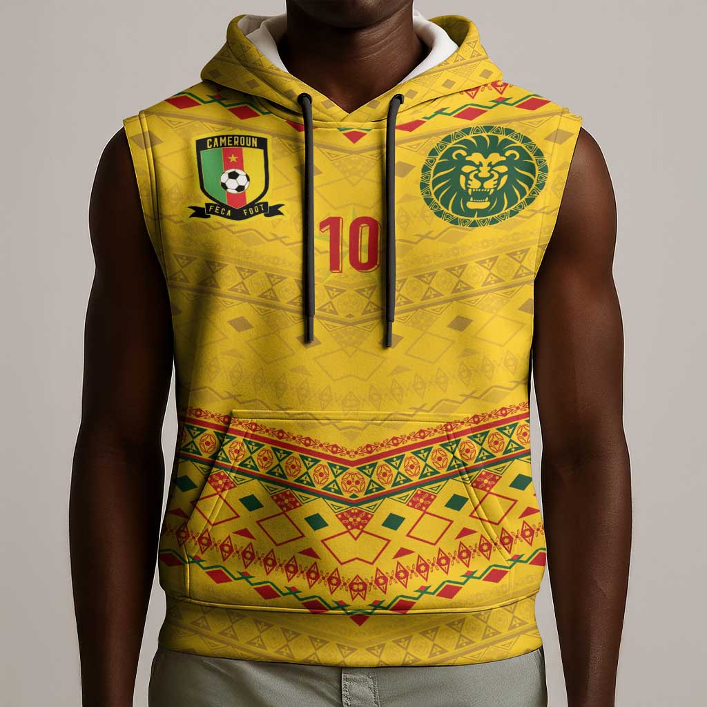 Custom Cameroon Football Sleeveless Hoodie Tribal Motifs Yellow Color