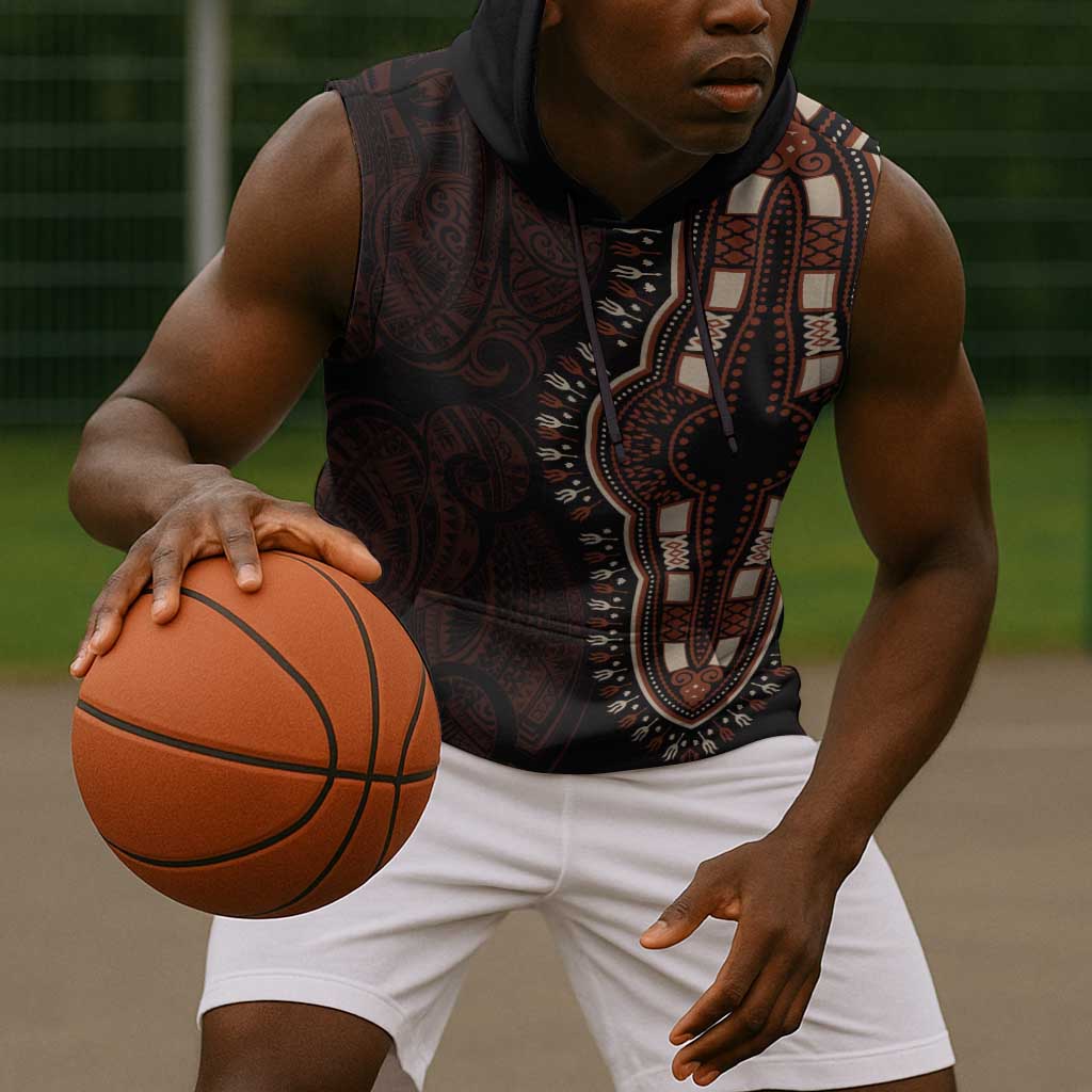 Dashiki and Polynesian Pattern Sleeveless Hoodie Afro Pacific Culture Red Version
