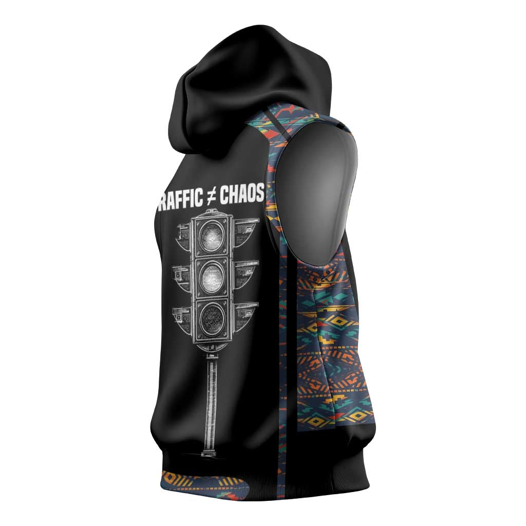 Garrett Morgan Sleeveless Hoodie with Full Body Portrait, Stop Wait Go Quote, Traffic Light Design