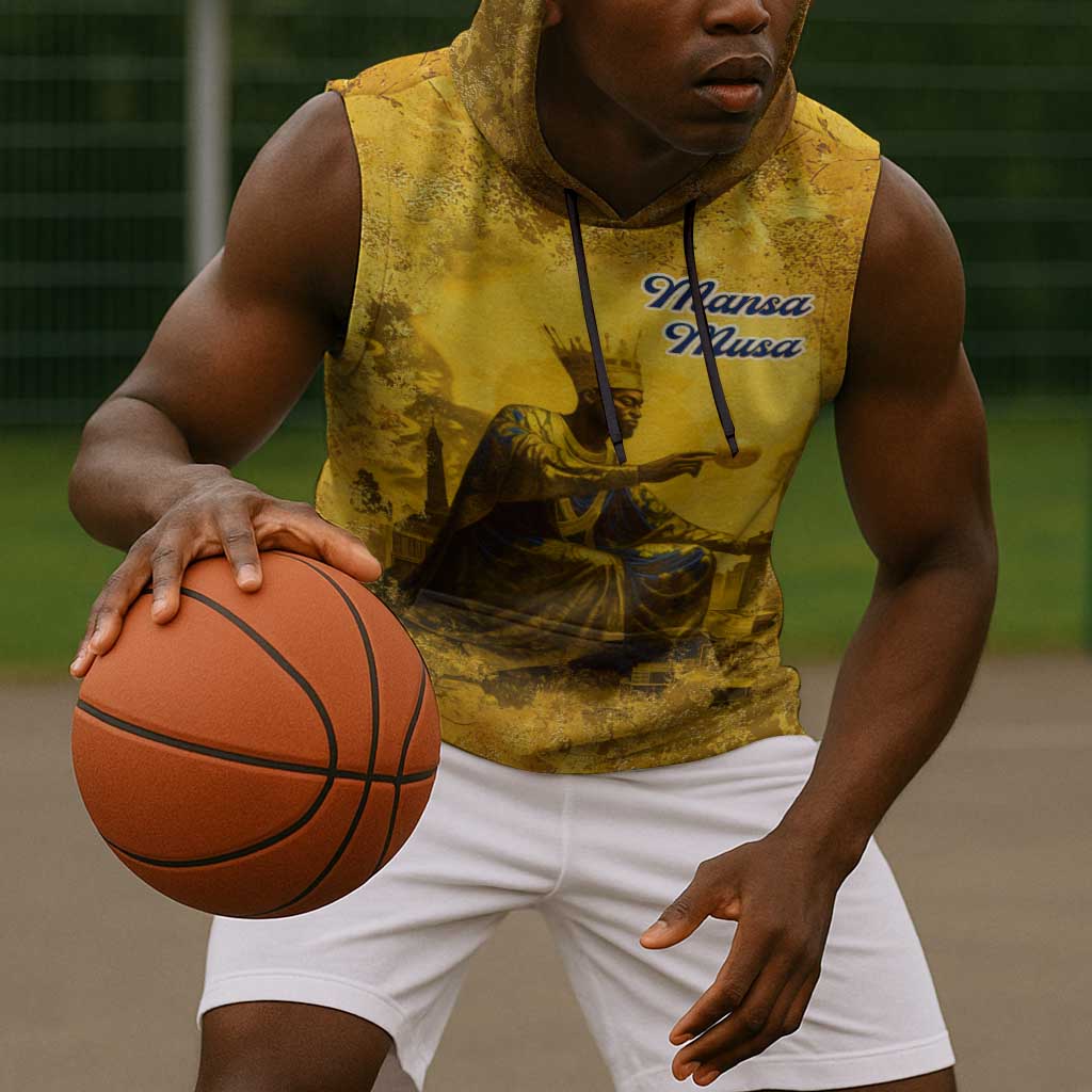 Mansa Musa Sleeveless Hoodie Golden Legacy Theme Ancient Map Regal Portrait of Mali Emperor Timbuktu