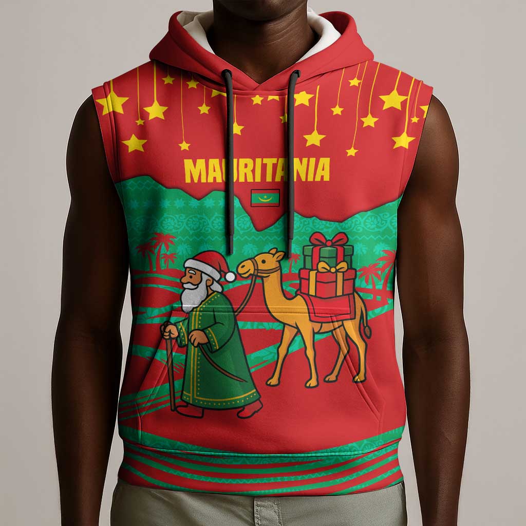 Mauritania Christmas Sleeveless Hoodie Santa Claus Camel Gift Boxes Starry Sky and Desert